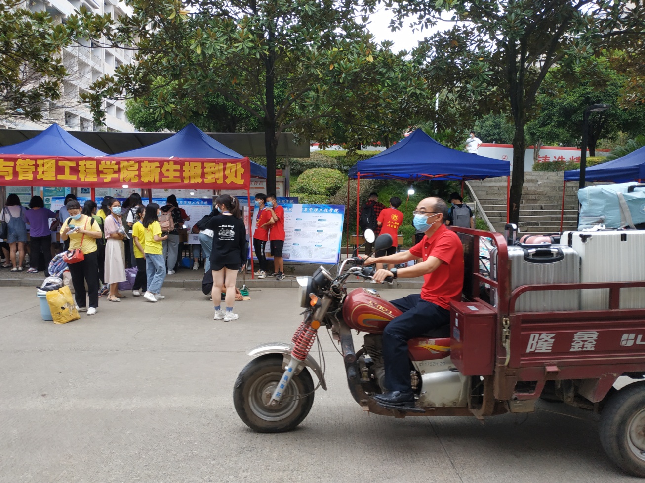 图为学院学工办主任刘世雄驾驶三轮摩托车帮新生搬行李