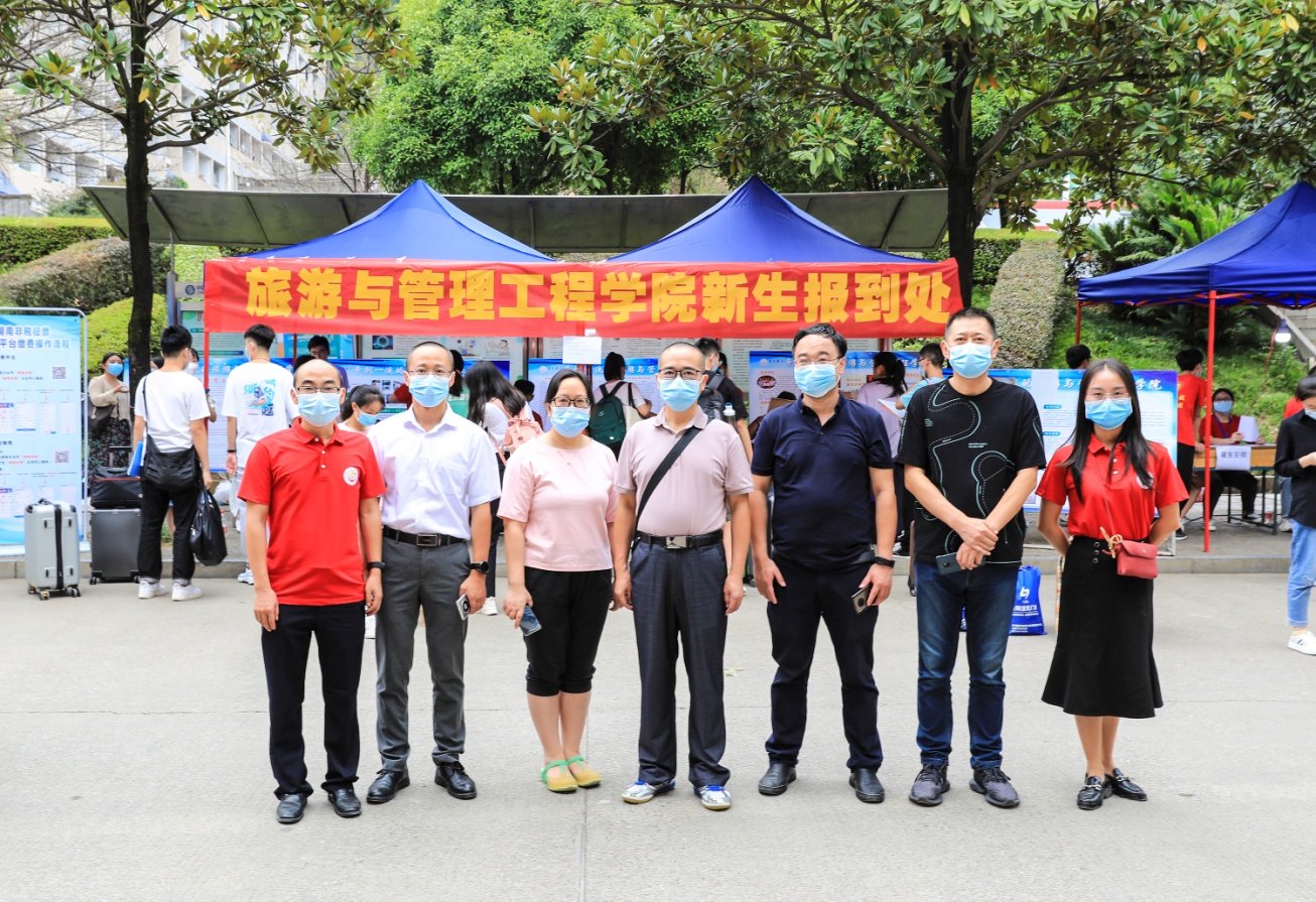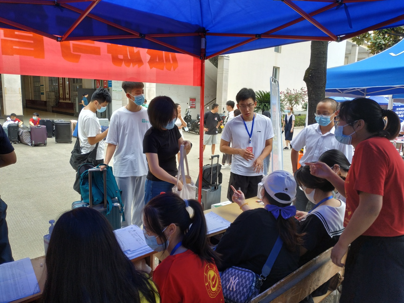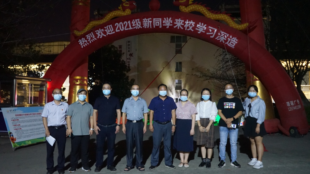 图为学院领导及工作人员在迎新报到点检查指导工作