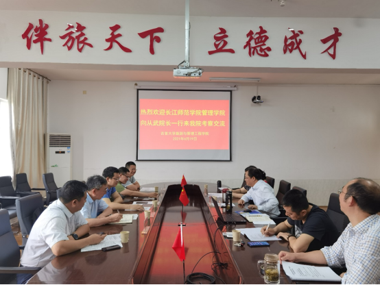 6月19日上午,长江师范学院党委委员、管理学院院长向从武、财经学院院长熊正贤、管理学院副院长张韵君、武陵山区绿色发展新型智库执行负责人谢正发、民革长江师范学院支部主委陈成龙一行5人来我院考察交流,我院主持工作副院长鲁明勇、旅游管理国家一流专业负责人尹华光、学科带头人粟娟及向昌国、李永飞、石金博士等教师代表参加了本次交流活动。
