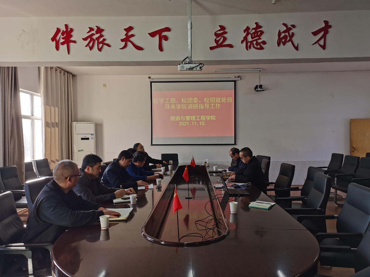 11月10日下午,学校学工部欧阳大文部长、校团委廖浩书记、校招就处向军处长、学工部彭校辉副部长、张家界校区学工办张建喜主任、校区团委谈宗凡副书记一行,前来我院调研指导。学院党委副书记李军、院团委书记赵潞、院学工办主任刘世雄参加了调研座谈会。