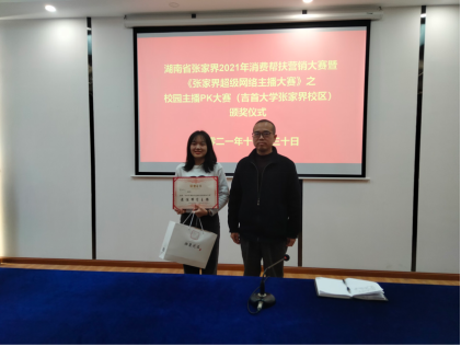 11月30日下午四点半,湖南省张家界2021年消费帮扶营销大赛暨《张家界超级网络主播大赛》之校园主播PK大赛颁奖仪式在旅游与管理工程学院第二教学楼2501报告厅顺利举行。来自市电子商务协会、张家界微生活电子商务公司及学院的领导师生参加了本次颁奖仪式,颁奖仪式由电子商务系主任戴志强老师主持。
