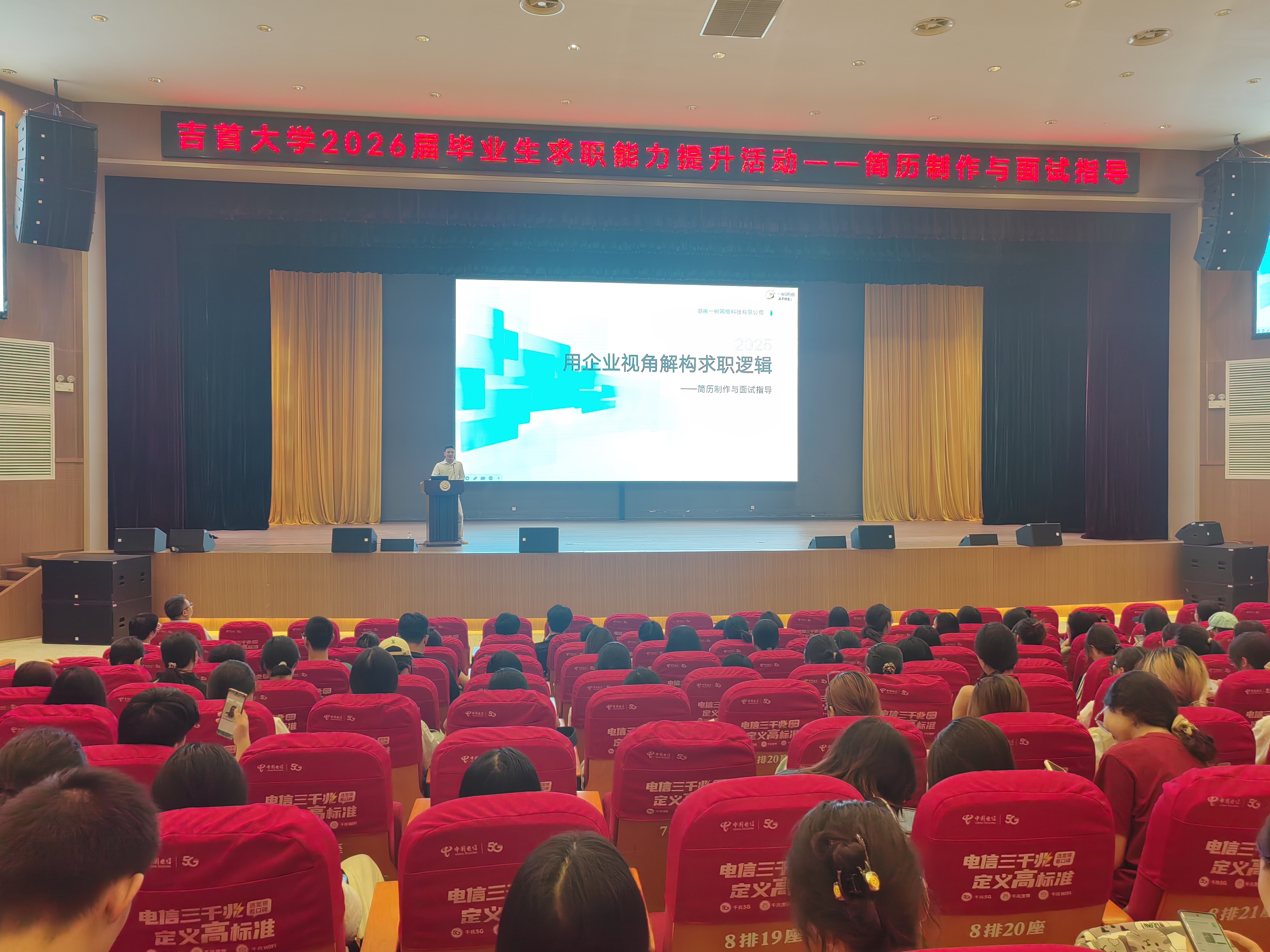 (本网讯 梅馨月)9月17日,为了提升2026届毕业生求职能力,招生就业处、张家界校区教学科研与学生事务中心在张家界校区大礼堂举办了2026届毕业生简历制作与面试指导专题讲座,主讲人为湖南一树网络科技有限公司CEO黄东旭,校区各学院500余名学生参加了讲座,讲座由yl23411集团党委副书记华骏主持。