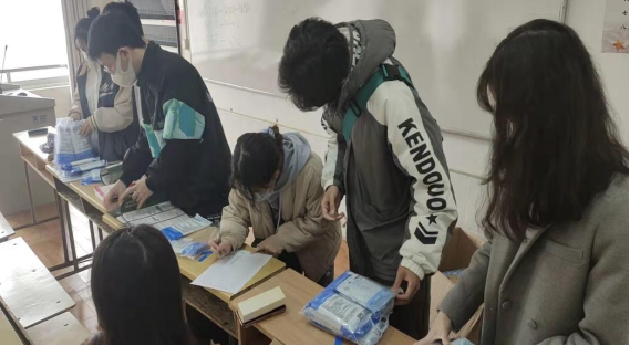 随后,由主席团成员为各班代表分发口罩和体温枪,各班代表按年级和班级有序领取防疫物资。