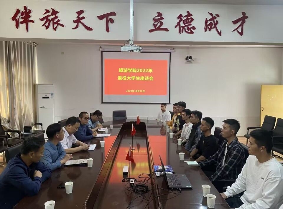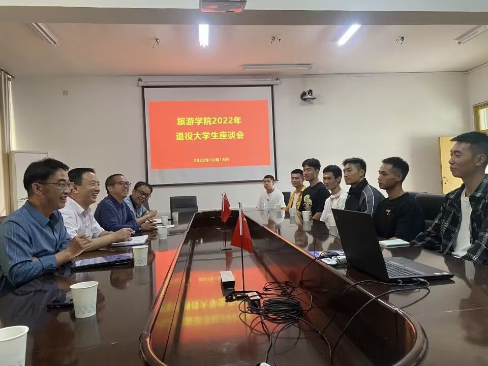 10月18日,旅游学院召开2022年退役大学生座谈会。退役学子分享从军经历,座谈交流升学或返校后思想、学习、生活等状况。旅游学院党委书记尚道文、副书记李军,副院长董坚峰,张家界校区教学科研与学生事务中心科长向志文出席,学院学工办主任刘世雄主持。