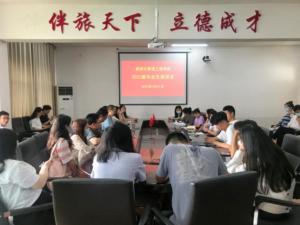 2022年5月31日,在毕业生即将离校之际,我院在2402会议室举办旅游与管理工程学院2022届毕业生座代表谈会,学院党委副书记李军,学院副院长董坚峰,院长助理蔡建刚,学工办主任刘世雄,团委书记赵潞,辅导员邝淑芳出席会议,33名毕业生代表参与会议。