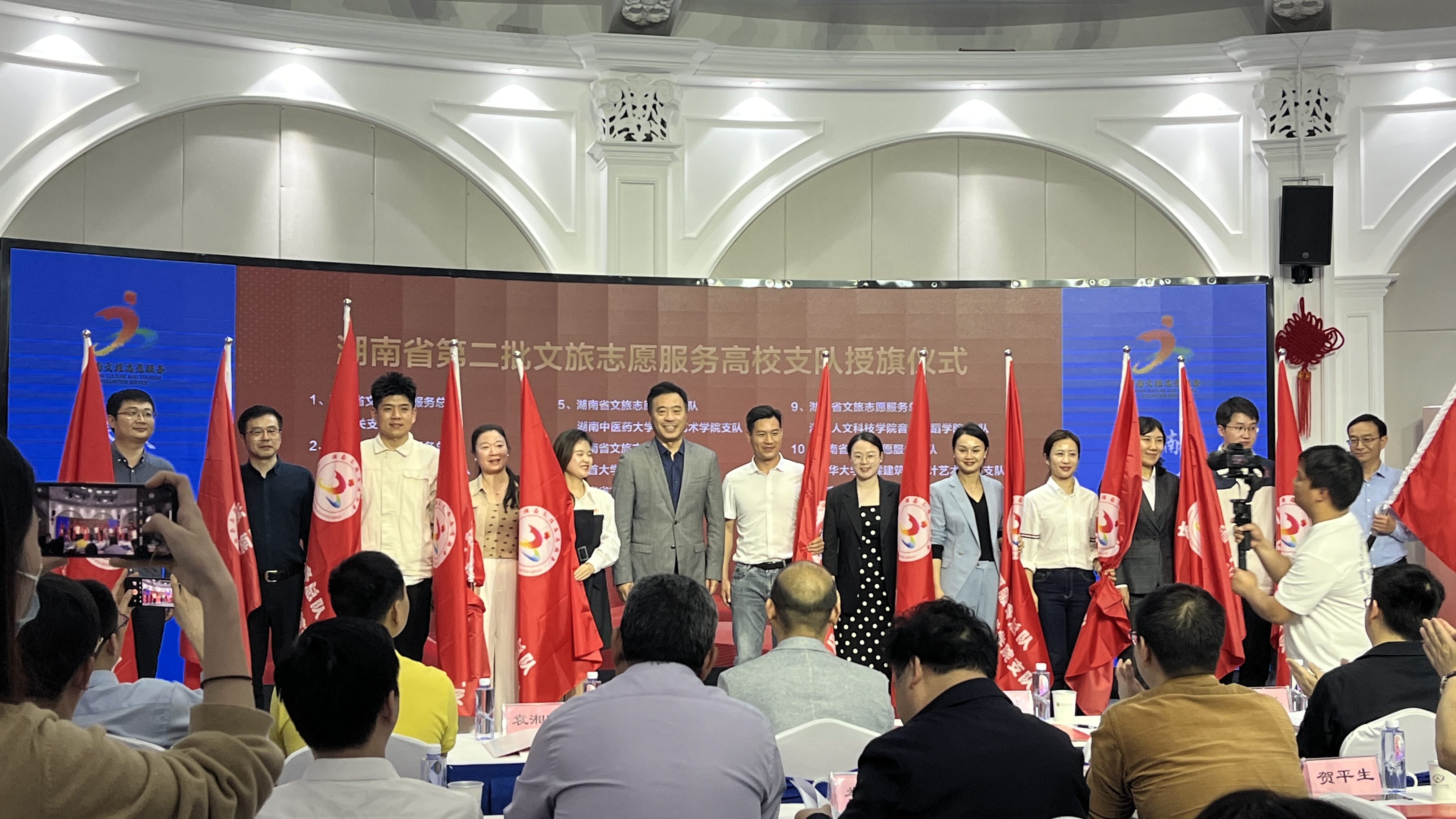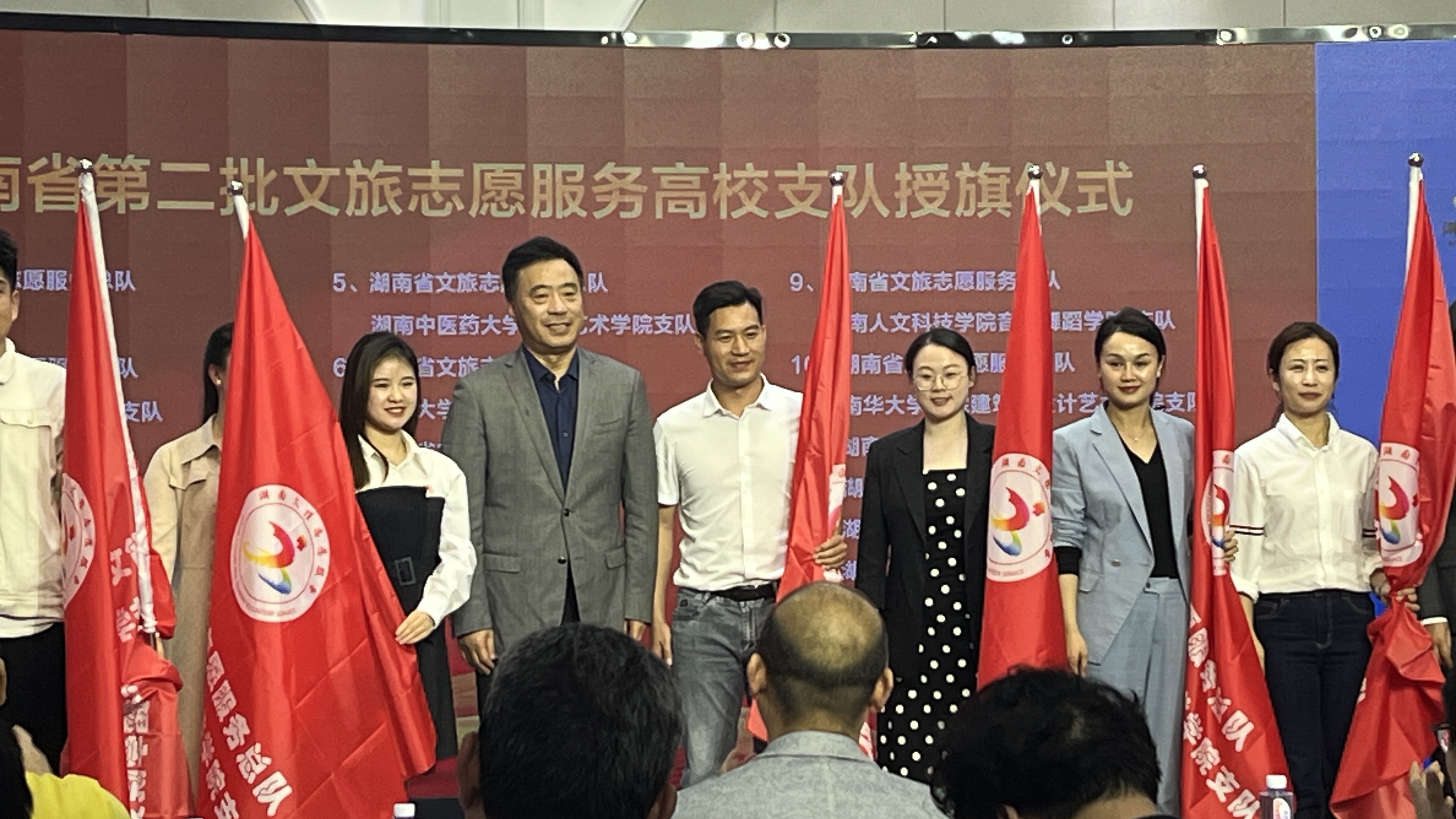 4月18日,湖南省文旅志愿服务先进典型发布仪式暨高校文旅志愿服务队授旗在湖南省少年儿童图书馆举行,湖南省文旅厅党组成员、副厅长尚斌出席会议。yL23411永利集团旅游学院辅导员刘雅菲老师从尚斌手中接过队旗,标志着我院文旅志愿服务正式起航。
