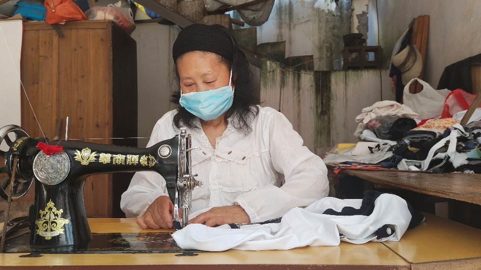 在略显拥挤的服装店内,年逾六旬的甄华芝坐在一台老式缝纫机前,正忙着修补一件校服的口袋,在双手来回推送间,缝纫机的踏板发出有节奏的“哒哒”声,动作娴熟而有力。
