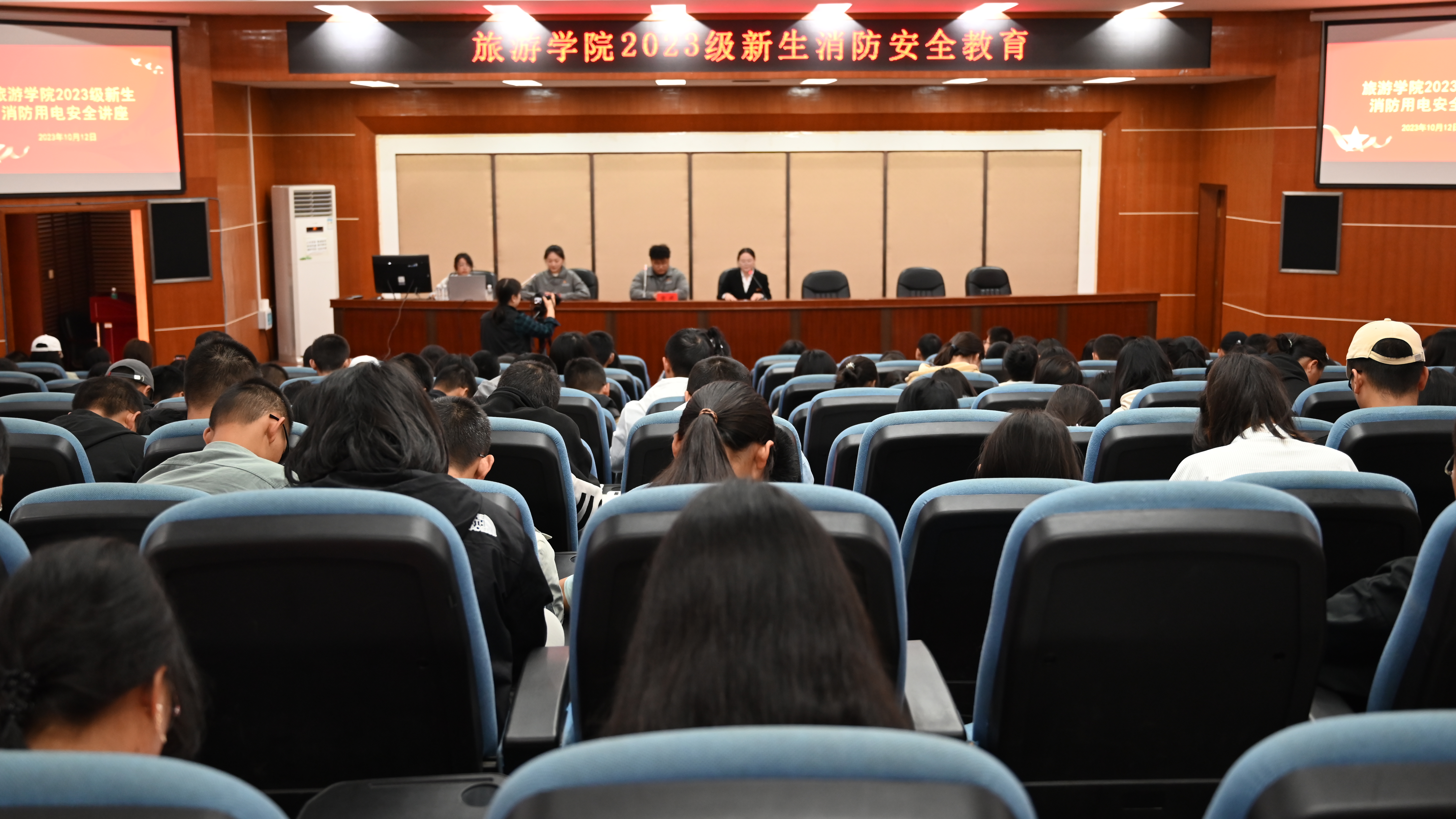 本网讯(刘薇苗)2023年10月12日旅游学院在逸夫楼多功能报告厅开设2023级新生消防安全讲座。2023级旅游学院新生、国网张家界供电公司专家代表团参加会议,其中由国网张家界供电公司专家李新一,余欢主讲,辅导员刘雅菲主持。