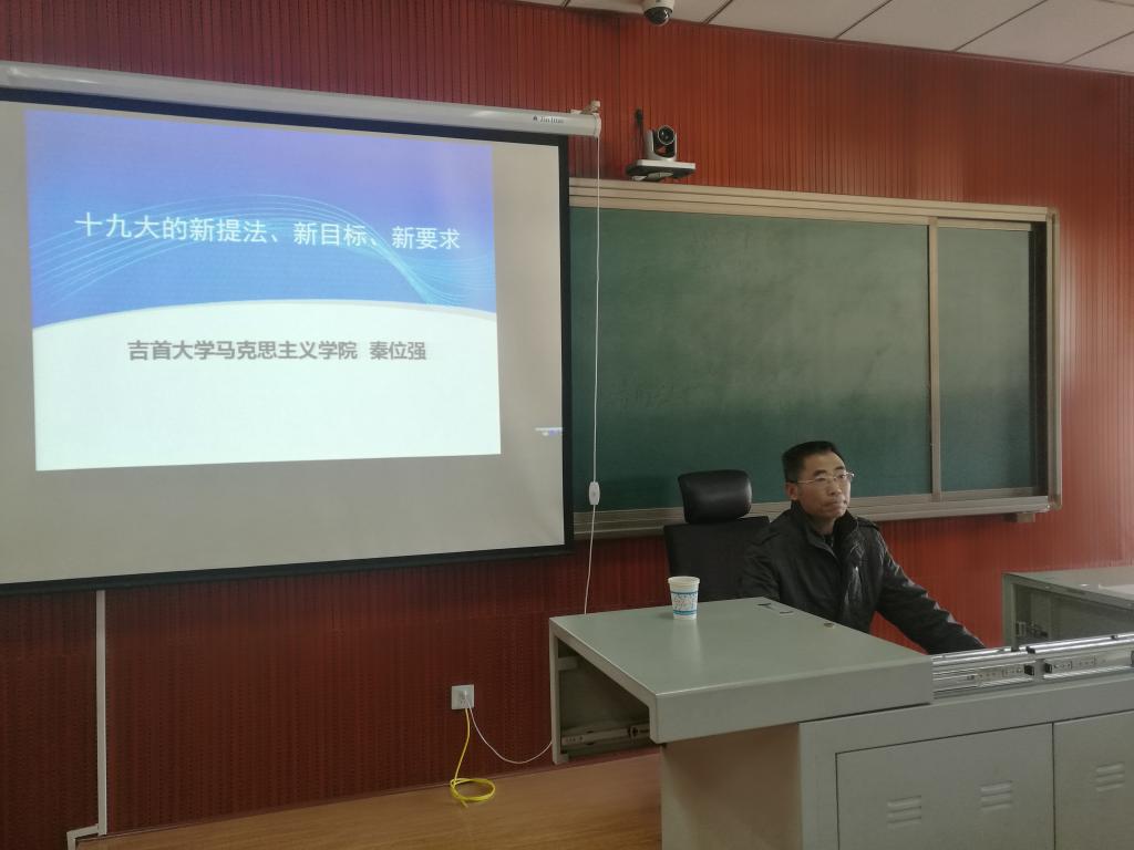 秦位强教授以“十九大的新提法、新目标、新要求”为题,深入浅出地阐述了党的十九大报告中十五个新的提法、两个新的目标、一个新的要求。他结合自身的感悟,希望师生们能够树立大国大党的自信,具体结合贯彻党的十九大精神,树立个人的奋斗目标。