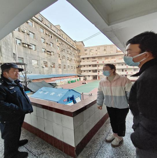 维持秩序:教场社区的服务中心下便是一所小学,马路时常有车辆经过,需保证儿童上学的安全并做好疫情防护工作。志愿者们在此期间进行提醒,一方面维持上下学的秩序,另一方面提醒儿童戴好口罩,做好防护。此外,志愿者还与教场社区的保安商讨了社区秩序维护的相关事宜,进一步了解具体情况并提出相应建议。