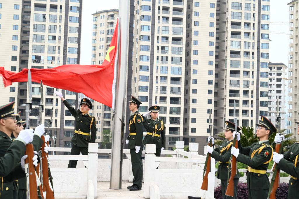 7时整,升旗仪式正式开始,国旗护卫队迈着整齐划一、铿锵有力的步伐,护卫着鲜艳的五星红旗走向旗台,国歌声回荡,国旗冉冉升起,全体师生庄严肃立。