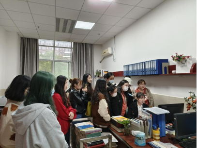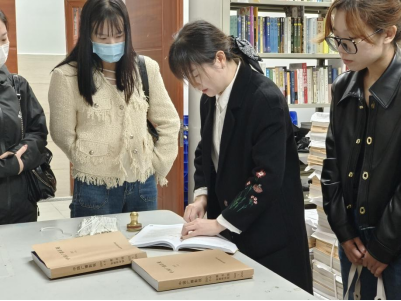 图为在黄晓燕老师的指导下学习过刊、图书等资料的加工流程
