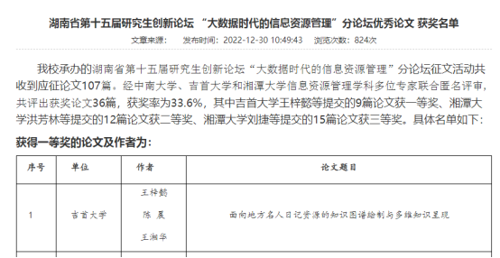 12月30日,由湖南省教育厅主办、湘潭大学承办的“2022年湖南省研究生创新论坛——大数据时代的信息资源管理”以线上线下结合形式在湘潭市顺利召开。来自中南大学、湘潭大学、中南林业科技大学等高校的100余名师生参加本次论坛。我院图书情报专业2020级研究生王梓懿、2021级研究生董娅茹等同学撰写的学术论文获得一等奖,并获邀在大会上公开宣读论文。同时,我院研究生获得二等奖2项、三等奖4项,获奖数量在全省高校中名列第二。
