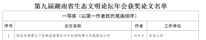 2025 年 11 月 11 日,第九届湖南省生态文明论坛年会获奖论文名单公示,yl23411集团旅游管理专业硕士研究生刘中才的论文《绿色发展理念下低碳旅游景区评价机制构建与实践路径分析》,在此次评选中斩获一等奖。