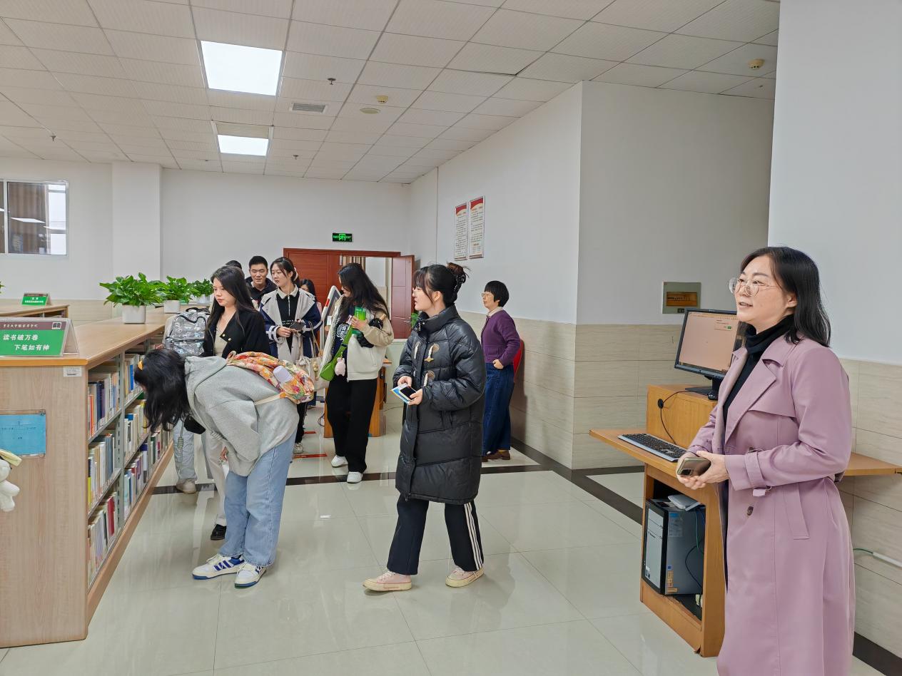 图为黄晓燕老师带领同学们参观图书馆