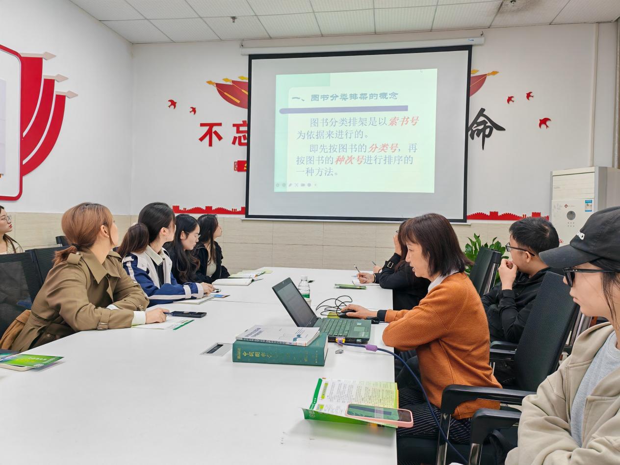 随后,张筠老师为同学们带来了一场题为《中国图书馆分类法》的精彩讲座。张筠老师以其深厚的专业素养和丰富的实践经验,深入浅出地讲解了图书分类的原理和方法,并结合具体实例,让同学们对图书分类有了更加直观和深刻的理解。讲座过程中,同学们积极听讲与互动,现场气氛热烈。实践活动进入动手操作环节时,黄晓燕和姚懿芳老师带领同学们来到了资源建设部,开始了图书编目、加工的实践操作。同学们轮流进行图书磁条粘贴、盖章以及图书MARC信息录入等工作。在老师们的耐心指导下,同学们逐渐掌握了图书编目、加工的基本技能,体验到了图书入库的全过程。此外,在社科图书阅览室,帅敏与刘烨等老师一起,指导同学们进行图书上架、整架的实践操作。同学们穿梭在书架之间,认真地将一本本图书按照分类法准确归位,体验到了图书馆员日常工作的辛勤与不易。