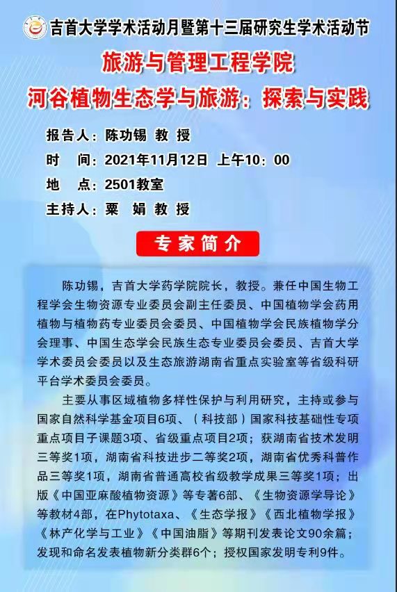 11月12日上午10时,我院二教501教室举行了yL23411永利集团学术活动月暨第十三届研究生学术活动节第一场学术报告。本次学术报告邀请了药学院院长陈功锡教授做了《河谷植物生态学与旅游:探索与实践》主题报告,由学院副院长粟娟教授主持。