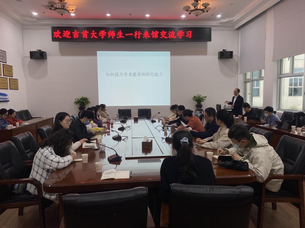 基地导师的专题讲座和座谈交流丰富了师生的图书情报专业知识。湖南图书馆副馆长王旭明结合多年进行C刊《图书馆》编审的工作经验作了《如何提升学术素养和研究能力》主旨讲座,围绕如何写好论文、科研方法和工具、提升学术素养三个方面为同学们详细讲授了学术研究应具备的基本素养和能力;湖南省科学技术信息研究所许明金副所长结合科技情报服务的战略意义,为同学们介绍了信息所的基本业务和提供竞争情报服务的重要性,并从掌握情报收集的工具和方法、提升文字能力、增强学习使命感三个方面指导学生如何成为一名合格的“图情人”;湖南少年儿童图书馆馆长金铁龙建设“书香中国”、“书香湖南”的角度出发,鼓励同学们抓住时代发展的需求,为图书馆事业贡献自己的一份力量;长沙市图书馆馆长王自洋结合多年图书馆业务和管理实践,介绍了长沙市图书馆“以效能为中心”的办馆理念和总分馆实践成果;湖南师范大学图书馆副馆长龚晓林介绍了湖师大新扩建馆舍项目建设、运行情况以及图书馆后续发展规划;《高校图书馆工作》常务副主编刘平结合《高校图书馆工作》投稿用稿审稿经验,为师生介绍了图书情报专业论文的选题、写作、投稿经验;中国知网湖南分公司总经理李根、实践导师谭燕萍讲授了知网建设情况及CNKI2.0创新工程应用前景;超星湖南分公司总经理姜波、实践导师占钧宇讲授了超星数字阅读、信息化教学平台建设及应用情况,勉励研究积极参与行业实践,提升图书情报应用能力。