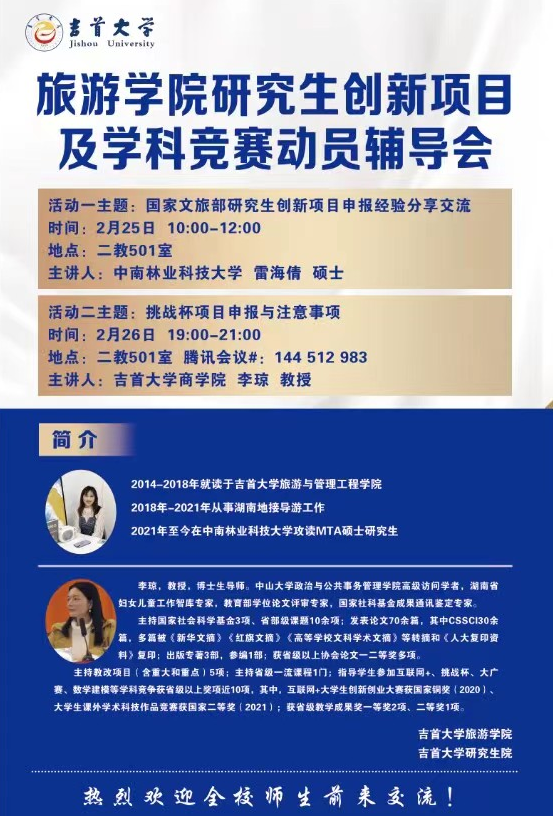 2023年2月25日,我院在二教501教室组织开展研究生创新项目及学科竞赛动员辅导会。“挑战杯”国家奖项目指导老师李琼教授、往届赛事优秀参赛选手雷海倩硕士作为分享嘉宾。旅游学院研究生及科研创新爱好者参加了此次讲座活动,学院副院长粟娟教授主持。