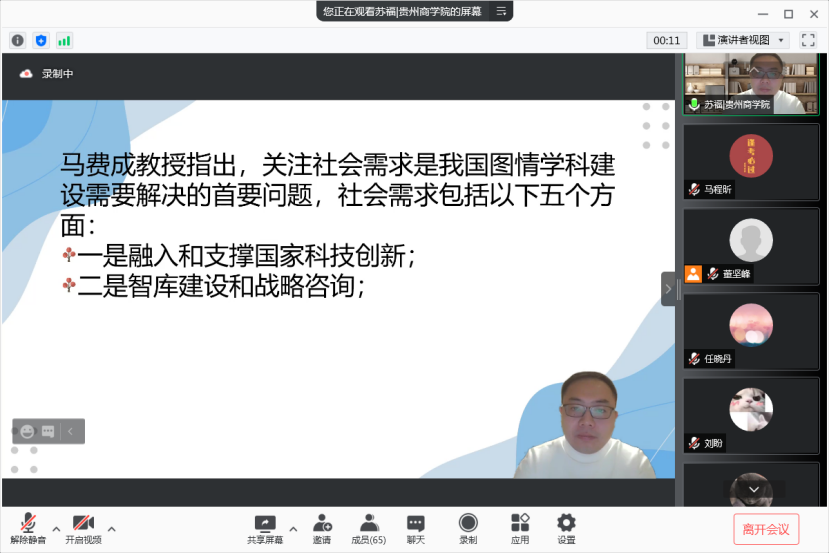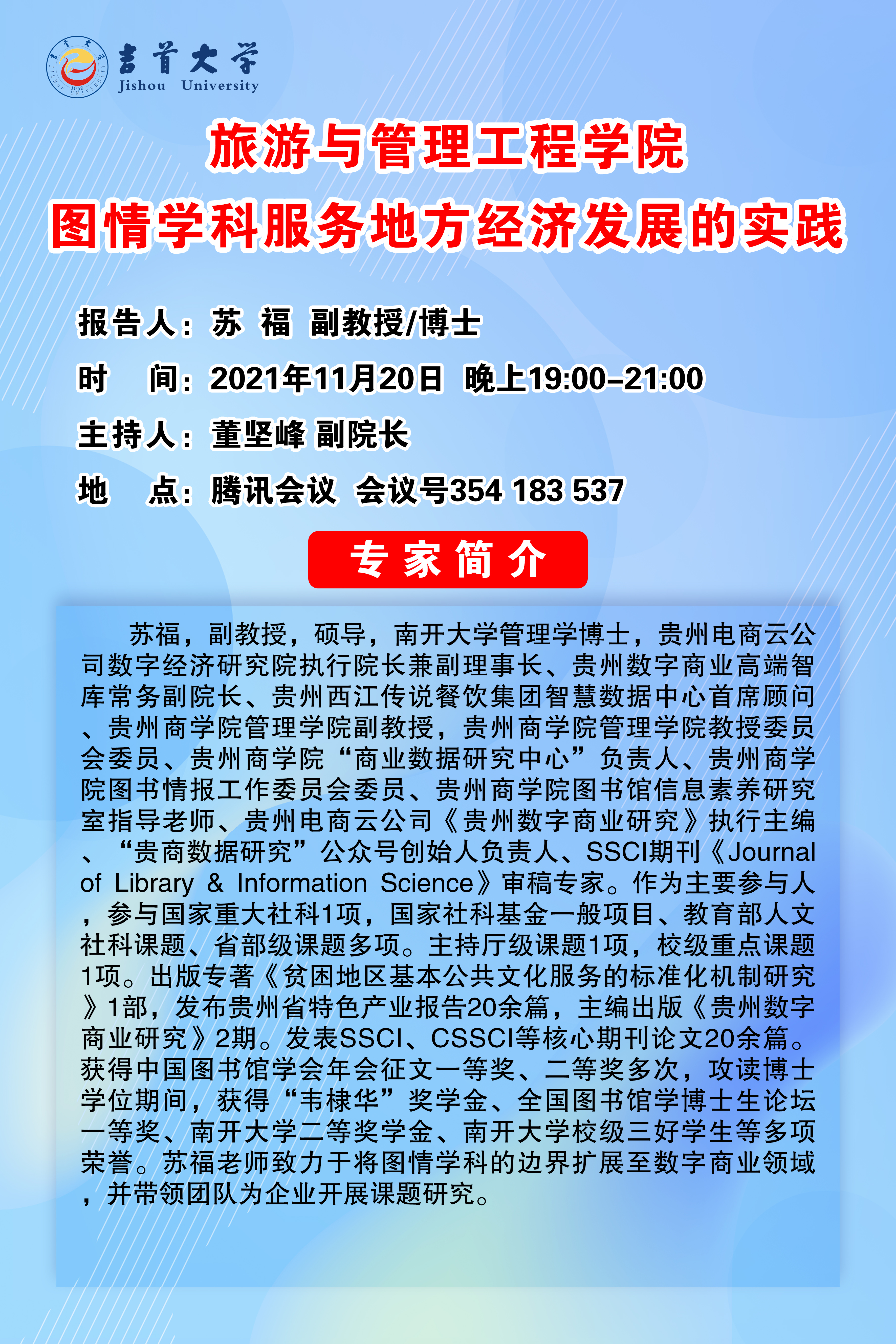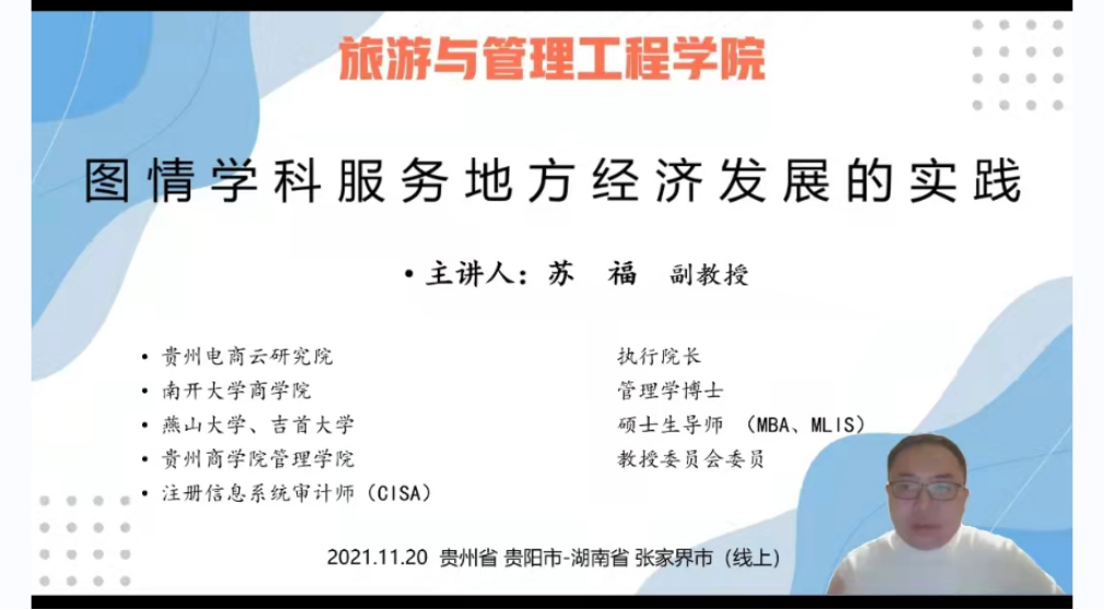 11月20日,我院邀请贵州商学院管理学院硕士生导师苏福博士以《图情学科服务地方经济发展的实践》为题进行主题讲座。讲座采用线上会议形式,由董坚峰副院长主持,我院图书情报研究生和部分导师共70余人参与了此次活动。